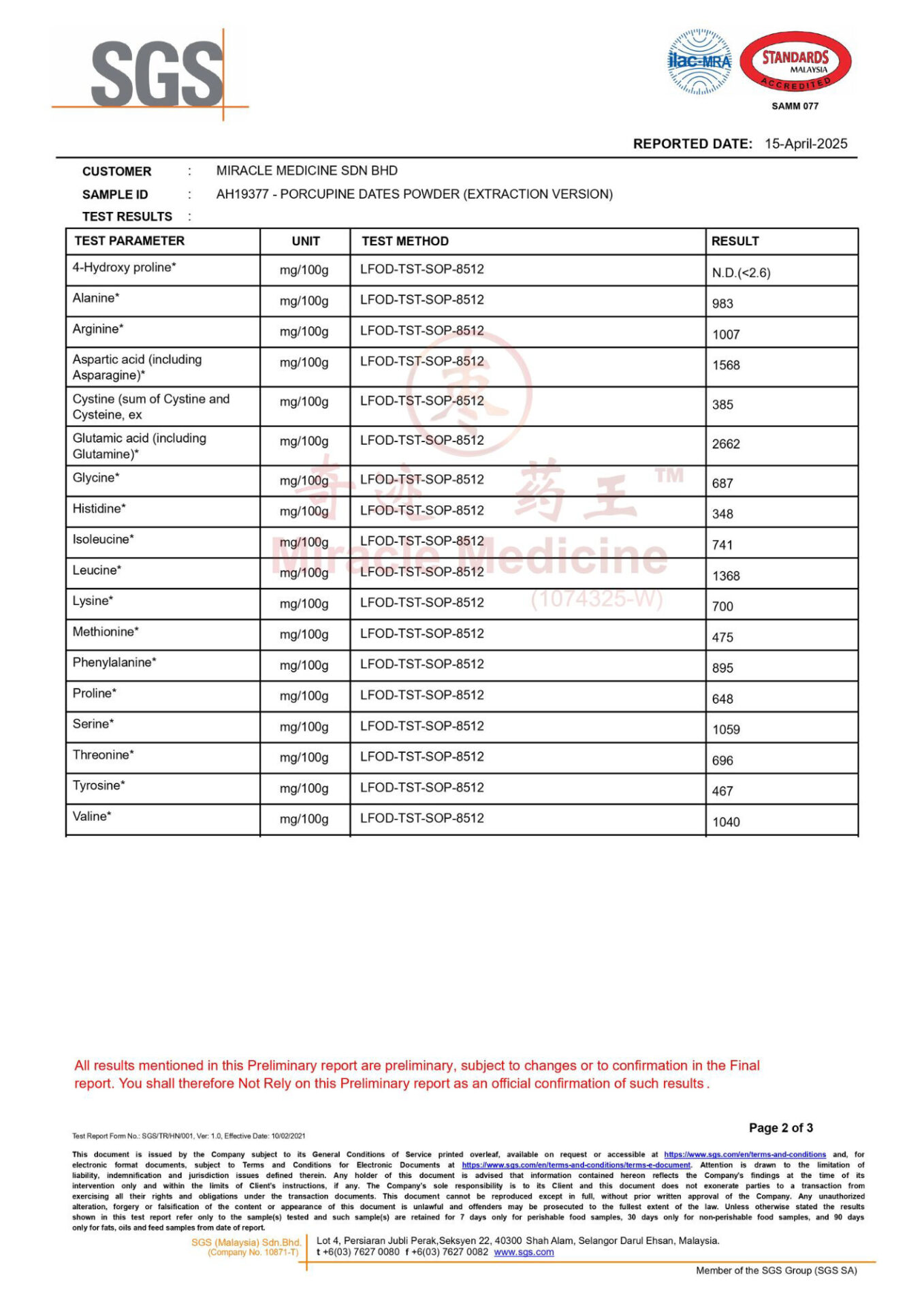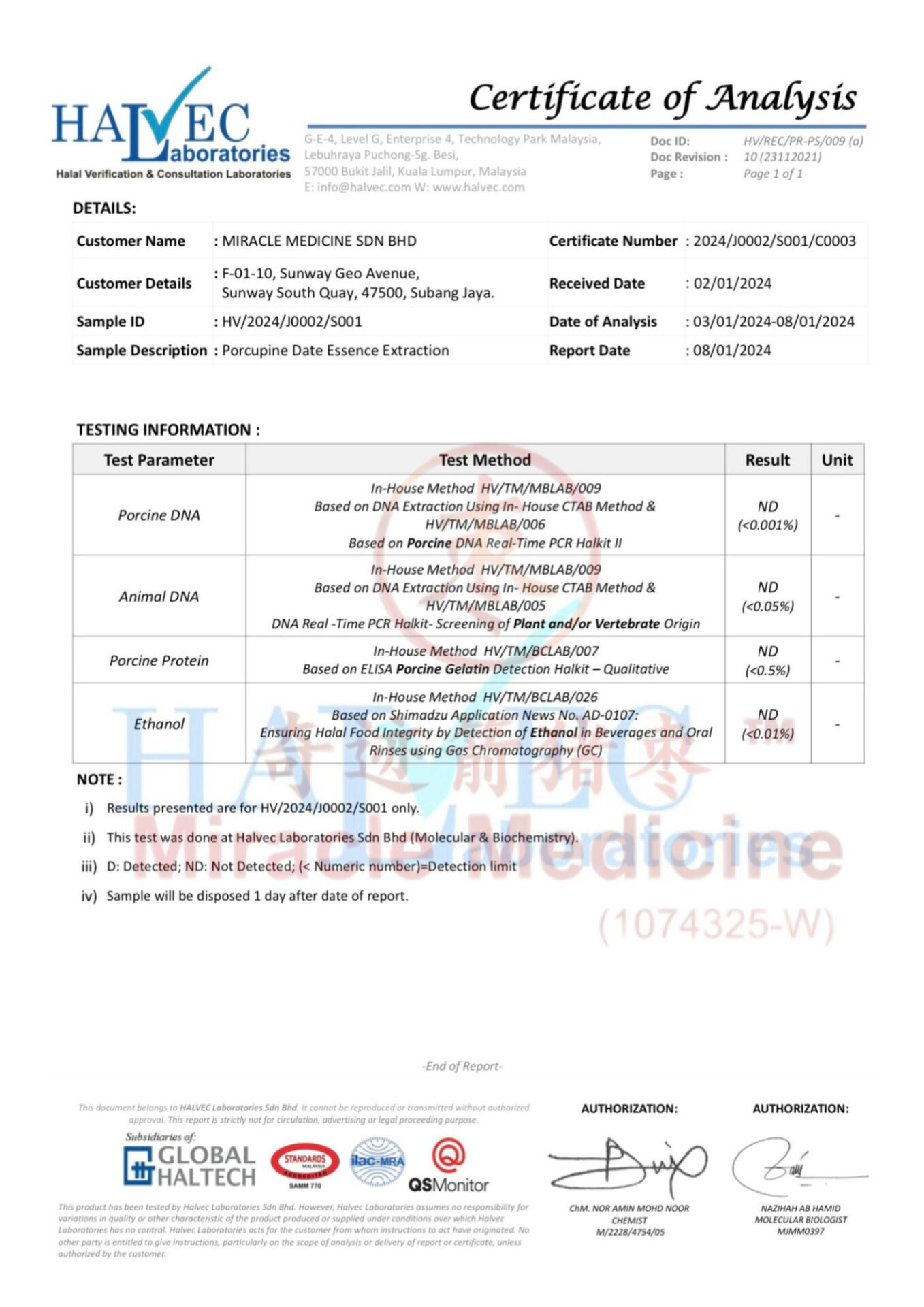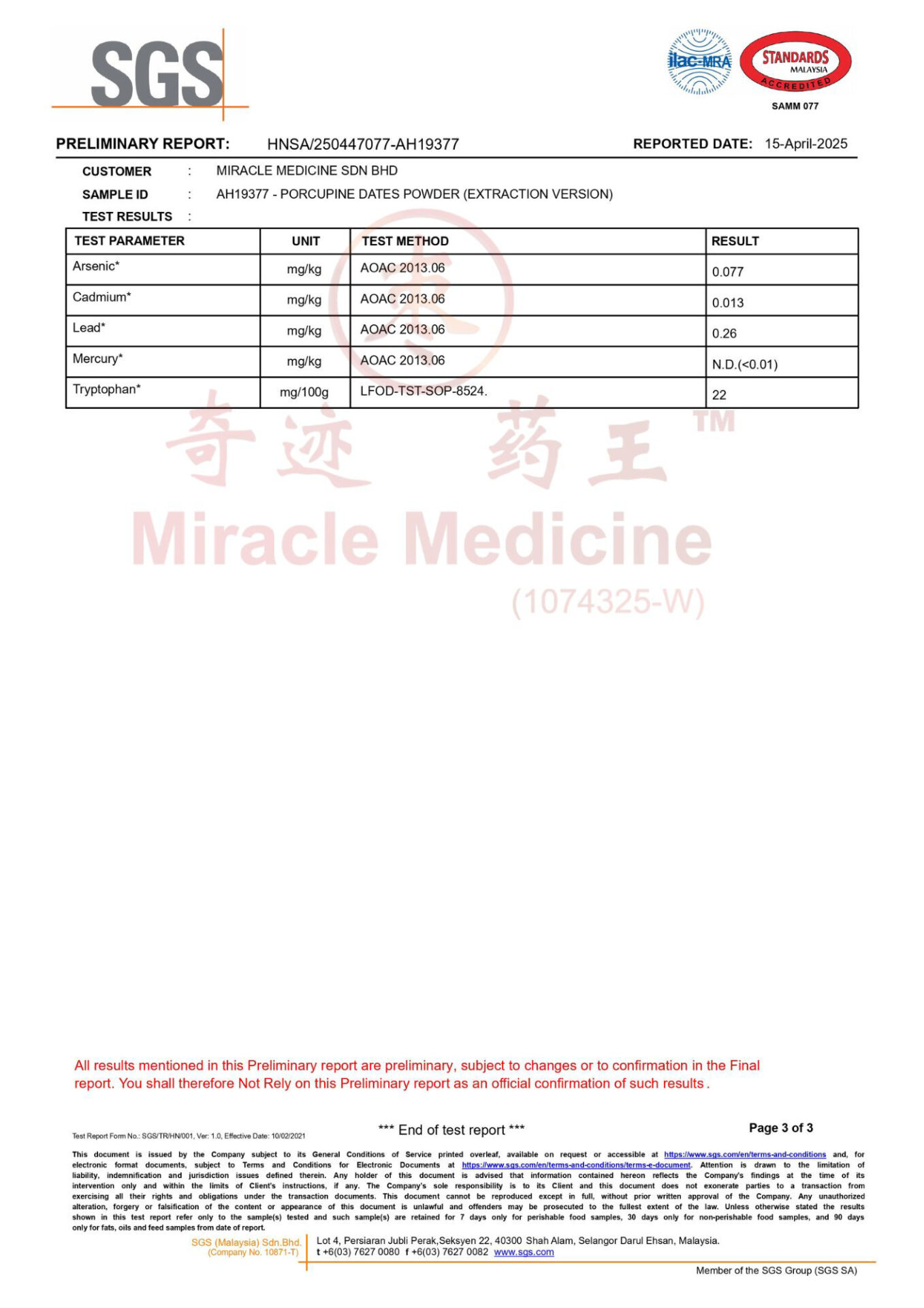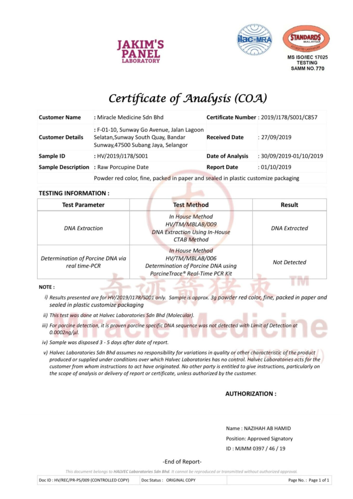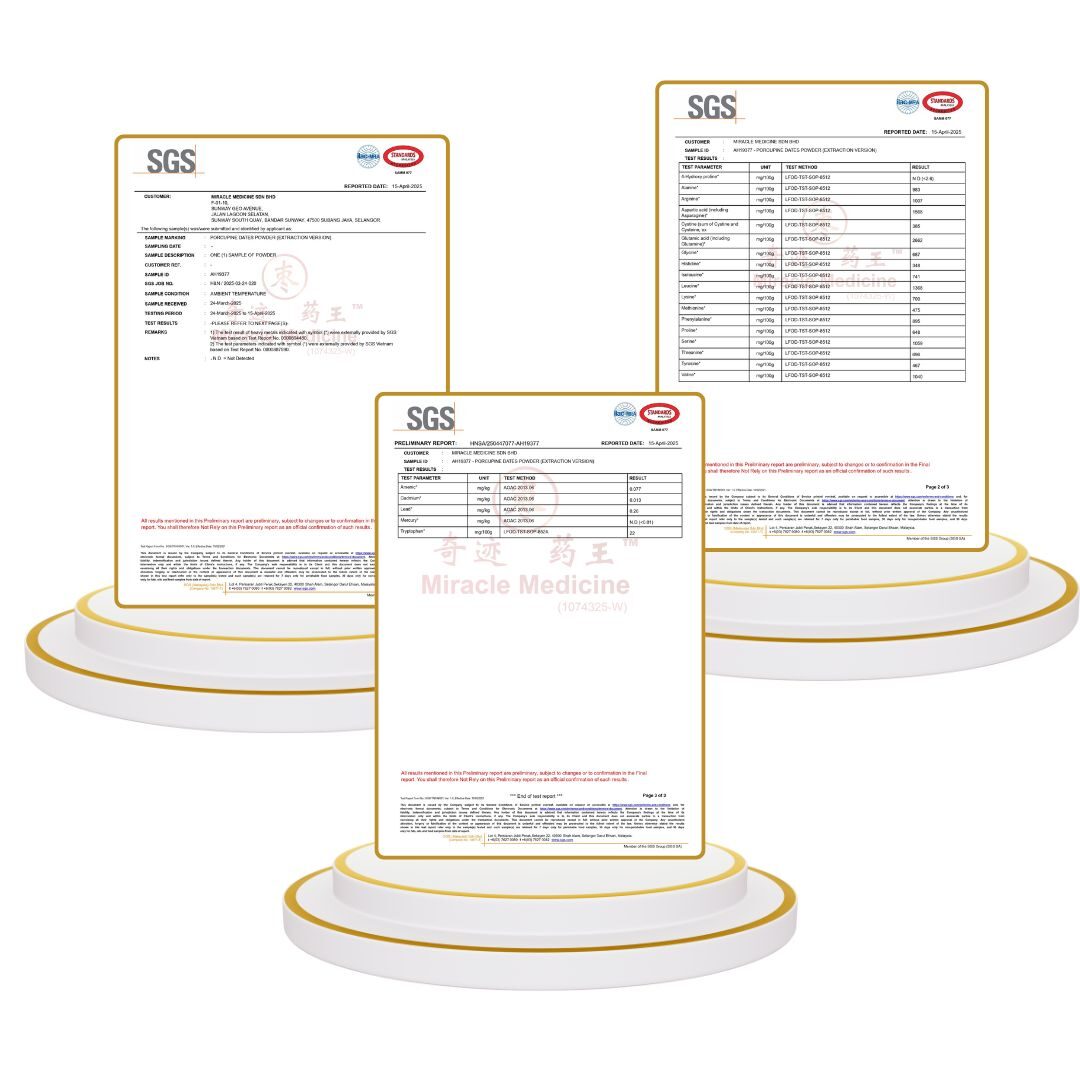 This certification shows that Miracle Medicine Sdn Bhd follows internationally recognized food safety management standards for the handling and processing of porcupine date materials.