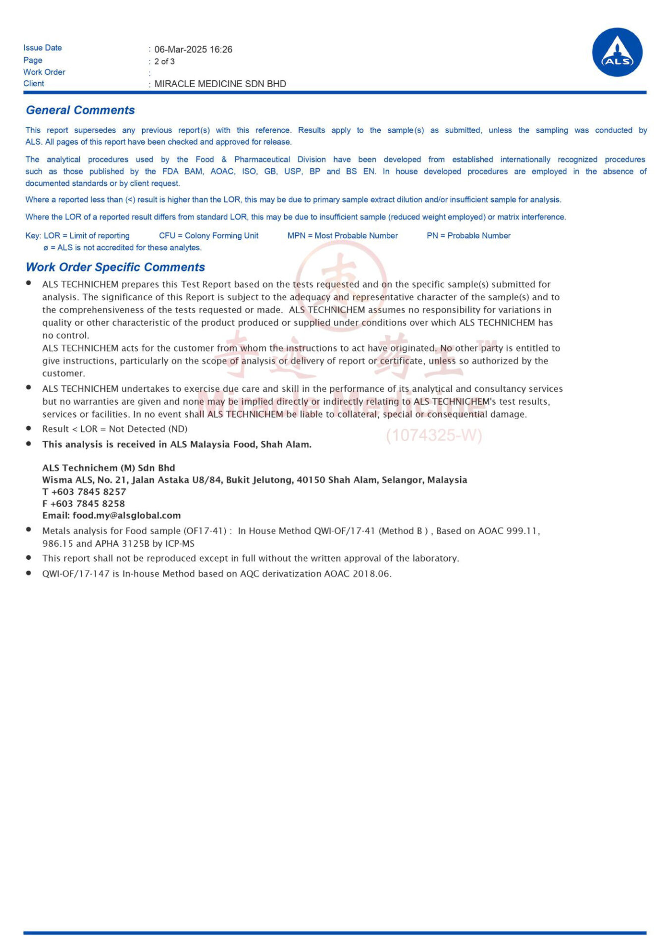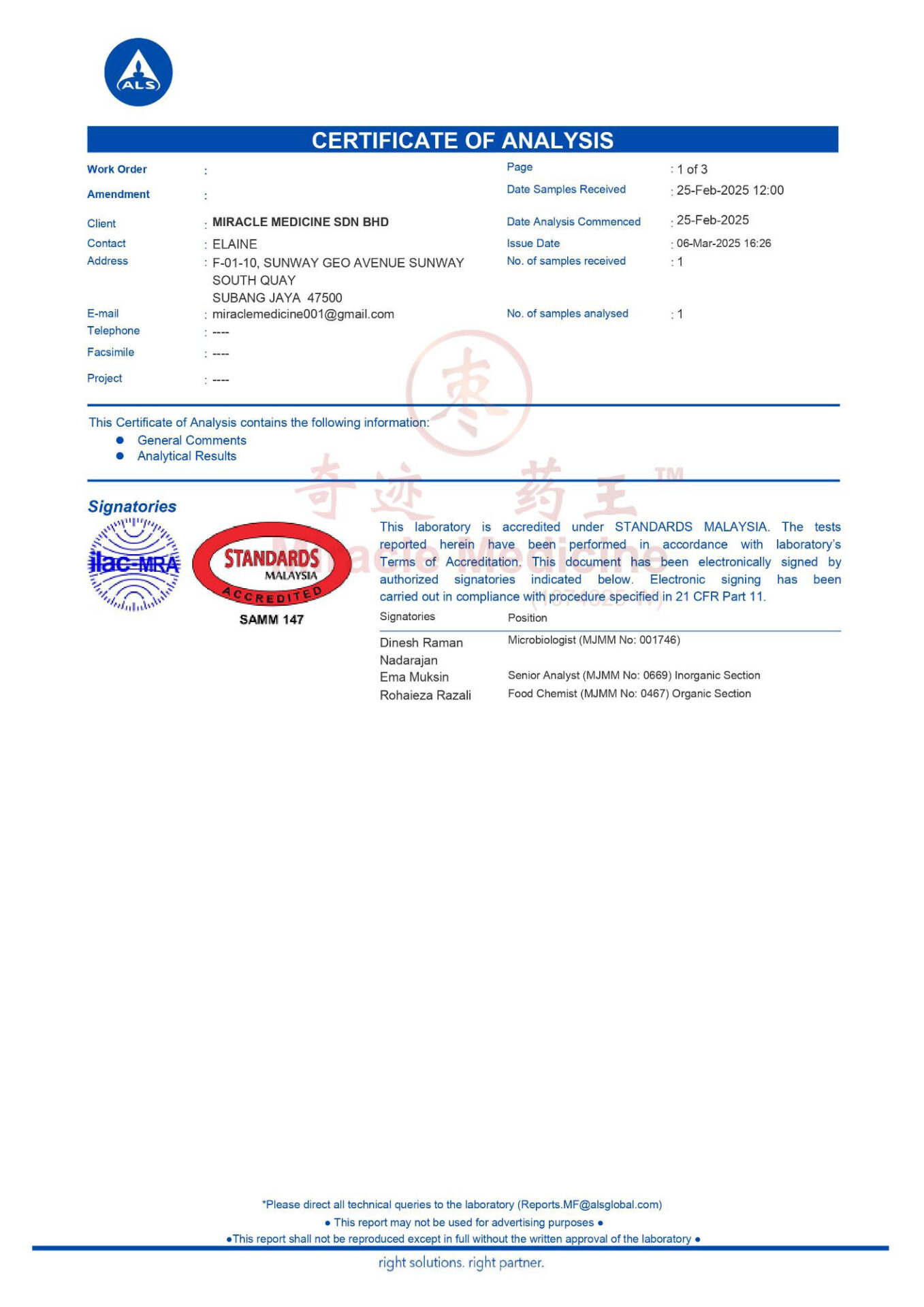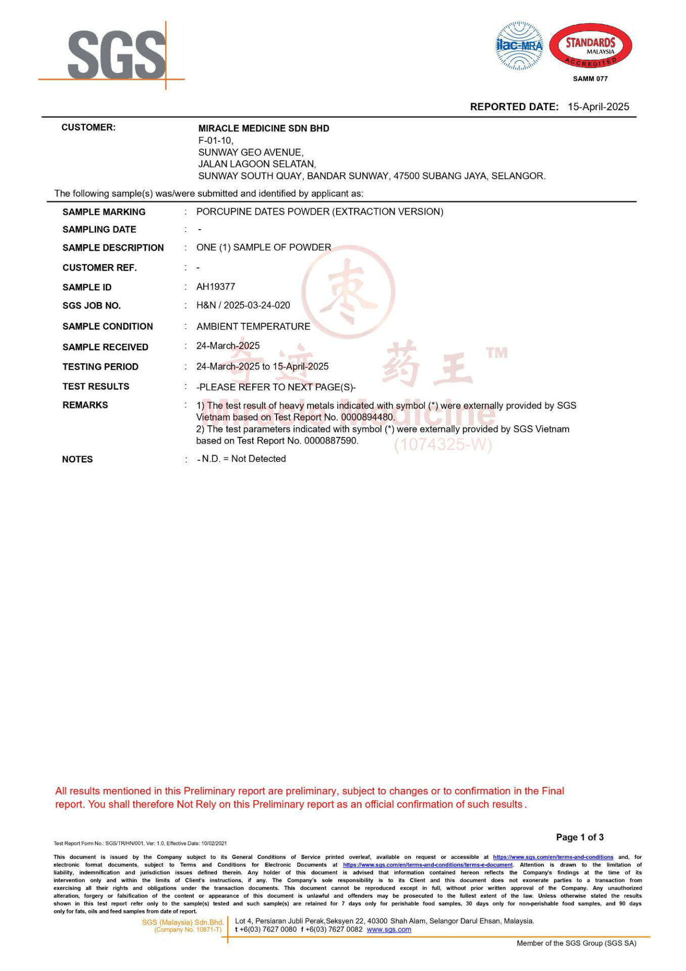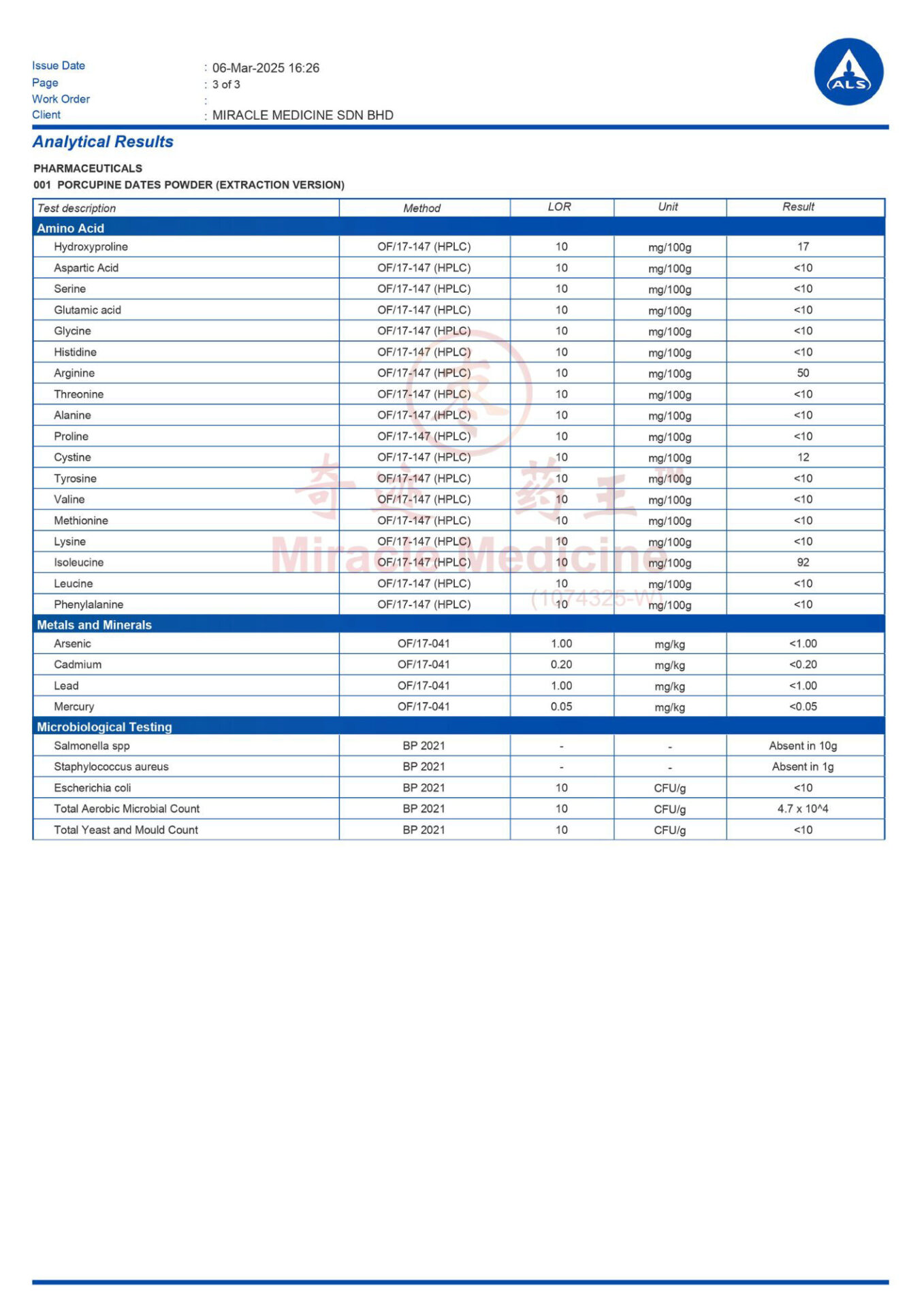 This certification shows that Miracle Medicine Sdn Bhd follows internationally recognized food safety management standards for the handling and processing of porcupine date materials.